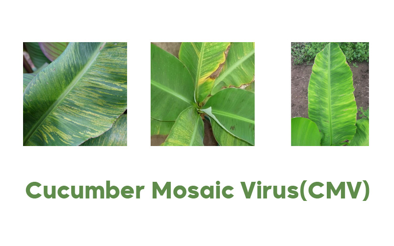 – در موز، آلودگی CMV با کوتولگی، کاهش سطح فتوسنتزی و عملکرد، و ماندگاری گیاه آلوده بهعنوان مخزن ویروس، خسارت غیرمستقیم و مستقیم ایجاد میکند.